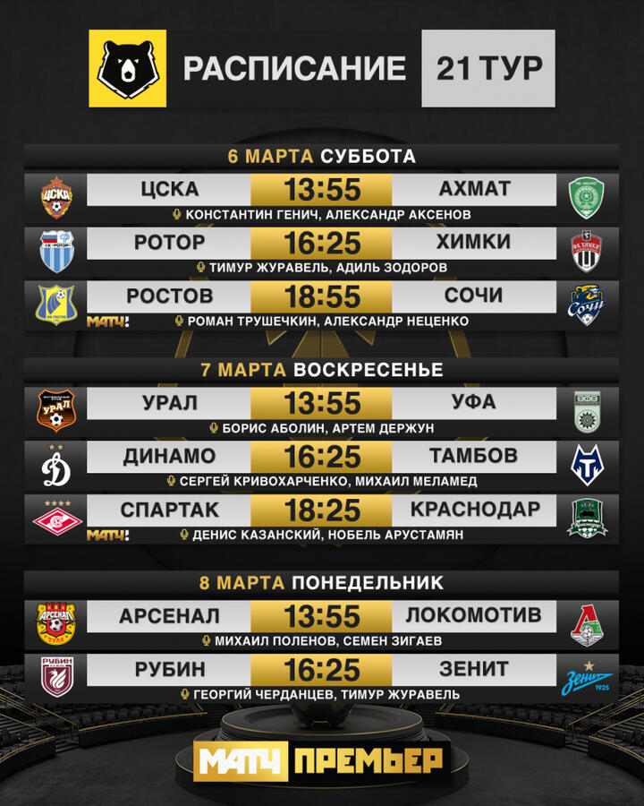 • Стало известно расписание трансляций матчей 21-го тура чемпионата России по футболу.