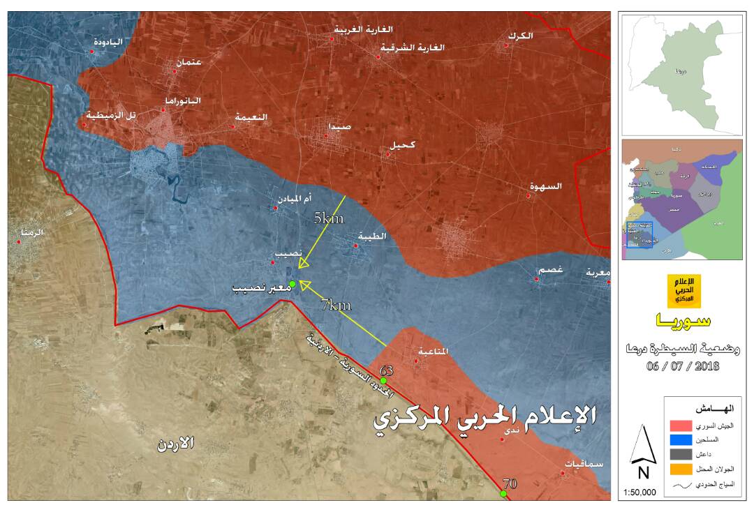 6.07.18 - Съёмка от "Военной медиа-службы" взятия САА КПП "Нассиб" и погранпостов до него вдоль границы со стороны провинции Сувейда согласно достигнутому соглашению с группировками ССА в регионе.