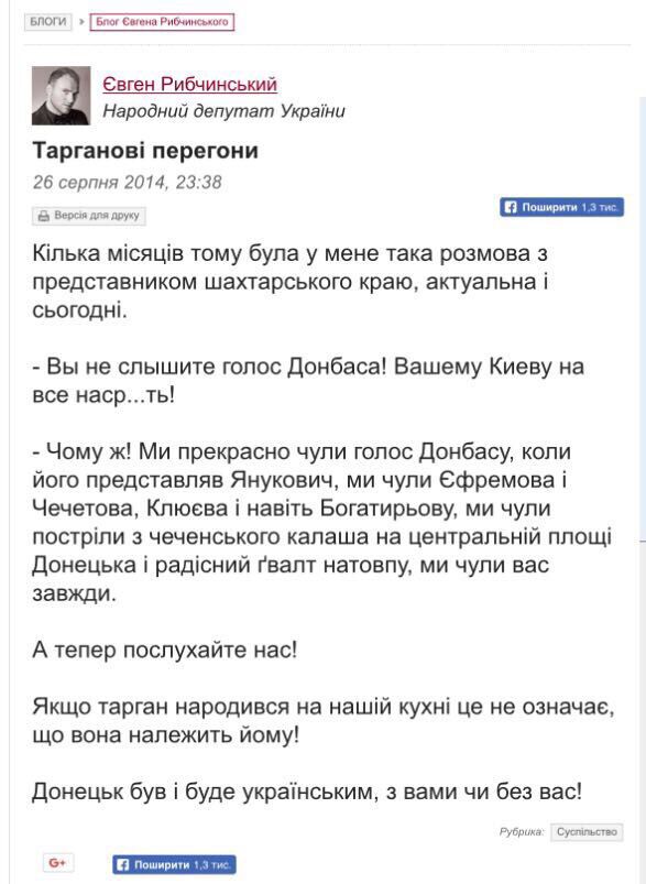 Рыбчинский также напомнил о том, что его позиция в этом вопросе остается неизменной с 2014 года. В подтверждение своих слов он привел свой пост, опубликованный в Facebook 26 августа 2014 года.