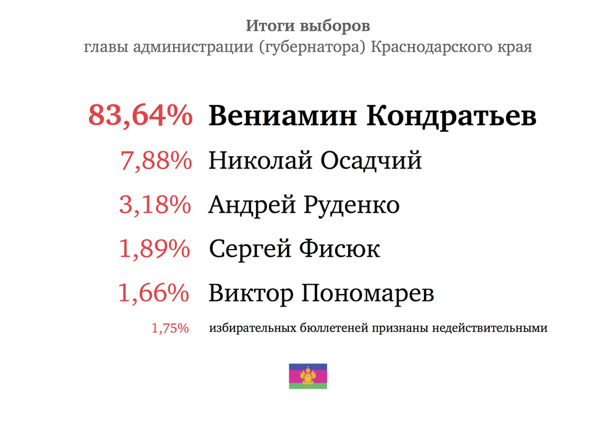 Региональный избирком обнародовал официальные итоги выборов губернатора Кубани. Явка составила 46,04%.